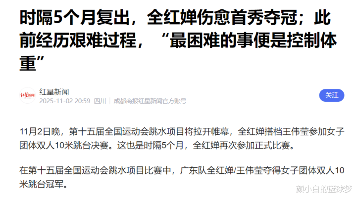 根据《成都商报红星新闻》的报道,全红婵复出夺冠此前经历艰难过程,最困难的就是控制体重。