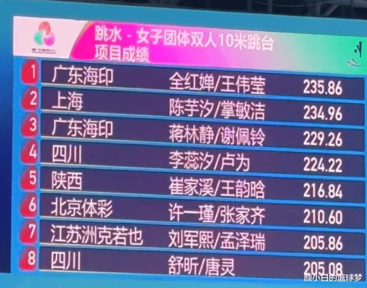 时隔183天全红婵再度夺冠了,全运会跳水女子团体赛,全红婵搭档王伟莹出战女子双人10米台,最终以235.86分力压陈芋汐/掌敏洁的234.96分,帮助广东队成功卫冕,两队的差距只有0.9分。