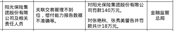 罚单显示,阳光保险集团股份有限公司的主要违法违规行为是:关联交易管理不到位,偿付能力报告数据不准确等。
